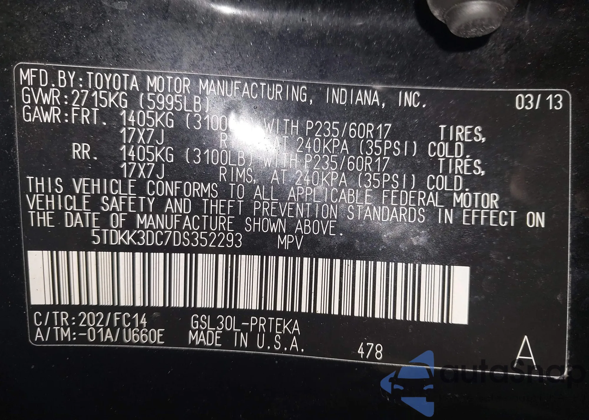 • VIN 5TDKK3DC7DS352293