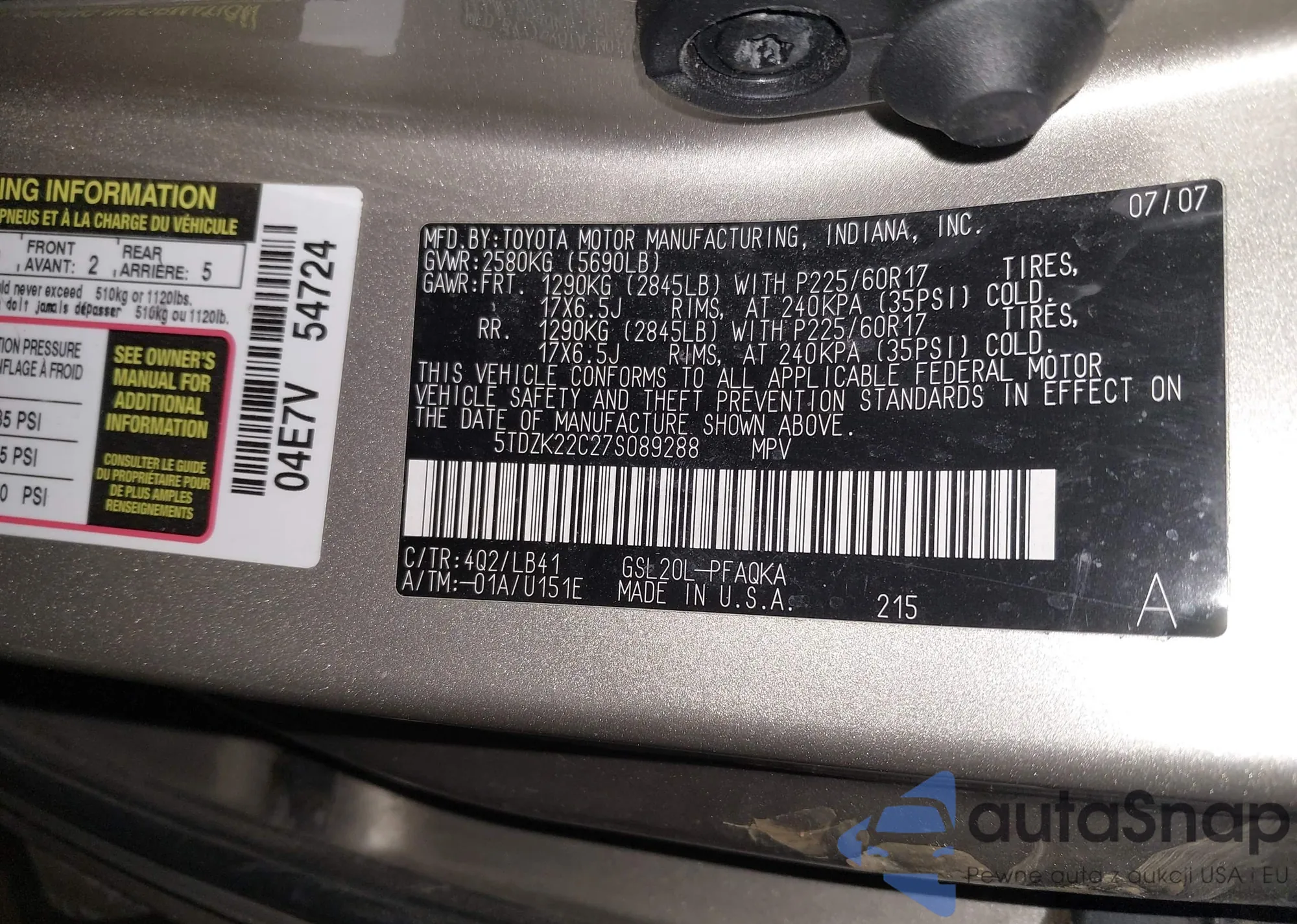 LOT: 44249610 VIN: 5TDZK22C27S089288