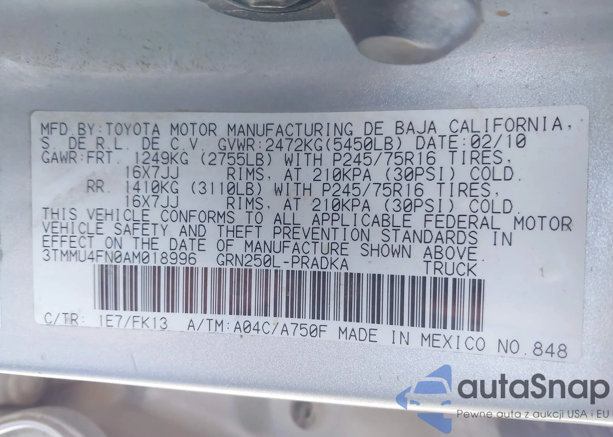 LOT: 44139459 VIN: 3TMMU4FN0AM018996