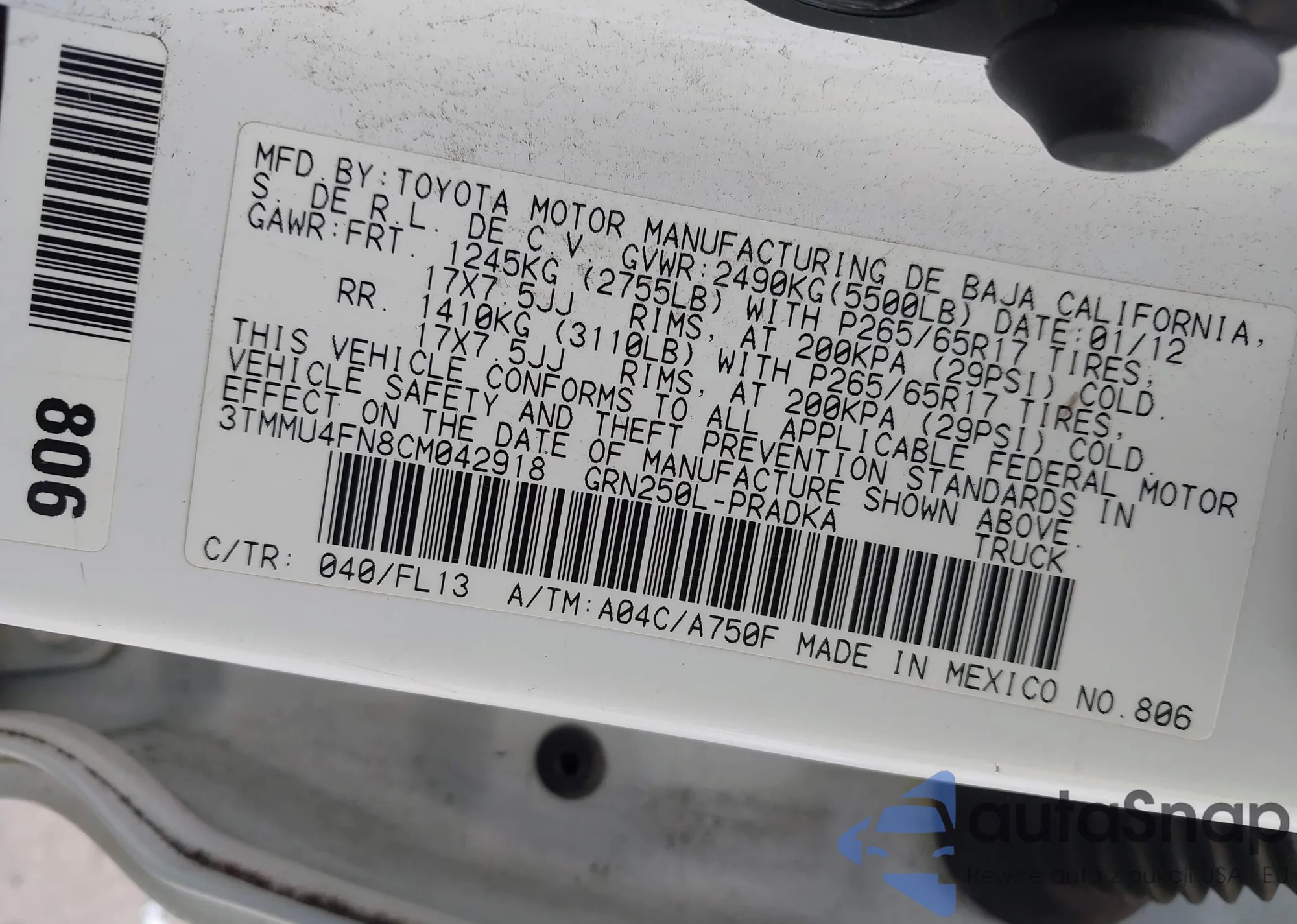 • VIN 3TMMU4FN8CM042918
