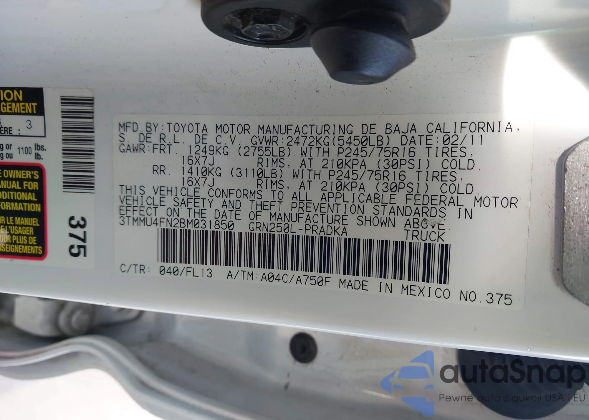 • VIN 3TMMU4FN2BM031850