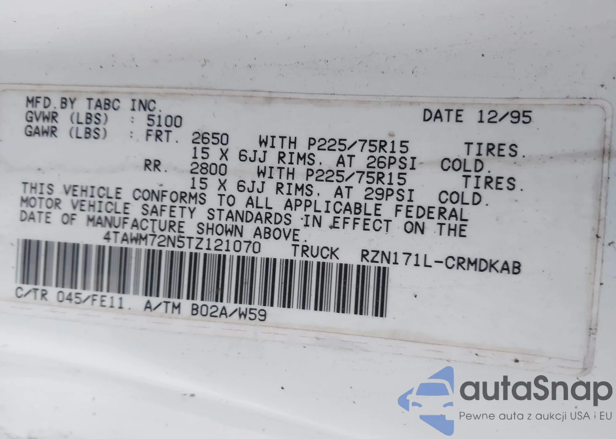 LOT: 43970049 VIN: 4TAWM72N5TZ121070