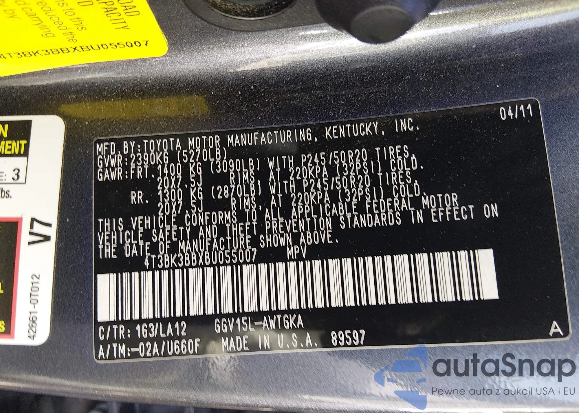 LOT: 44439340 VIN: 4T3BK3BBXBU055007