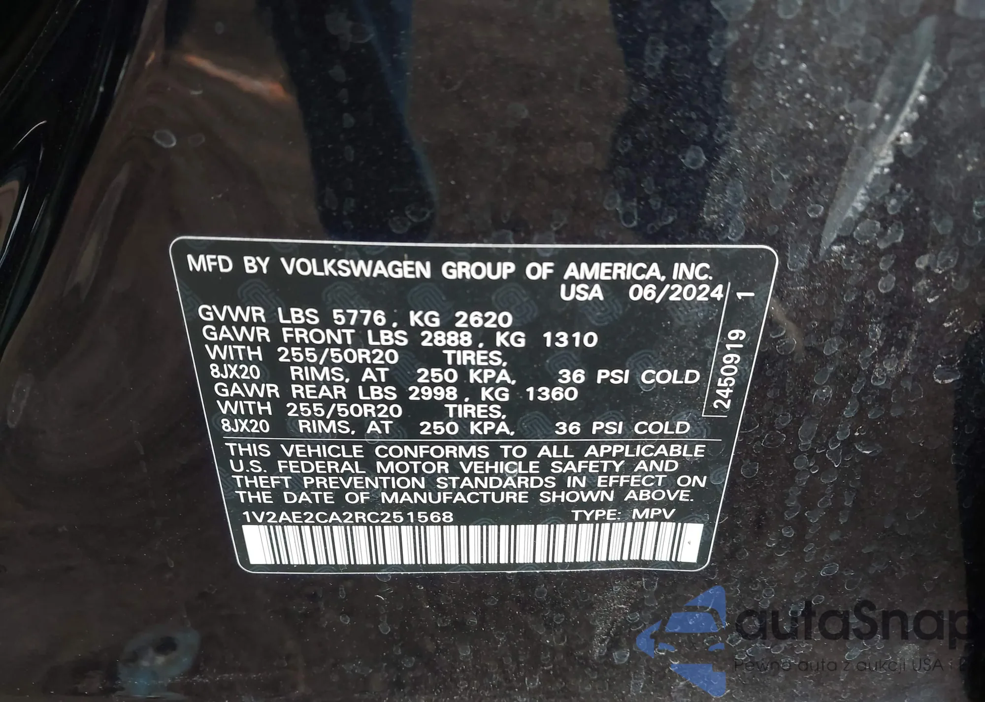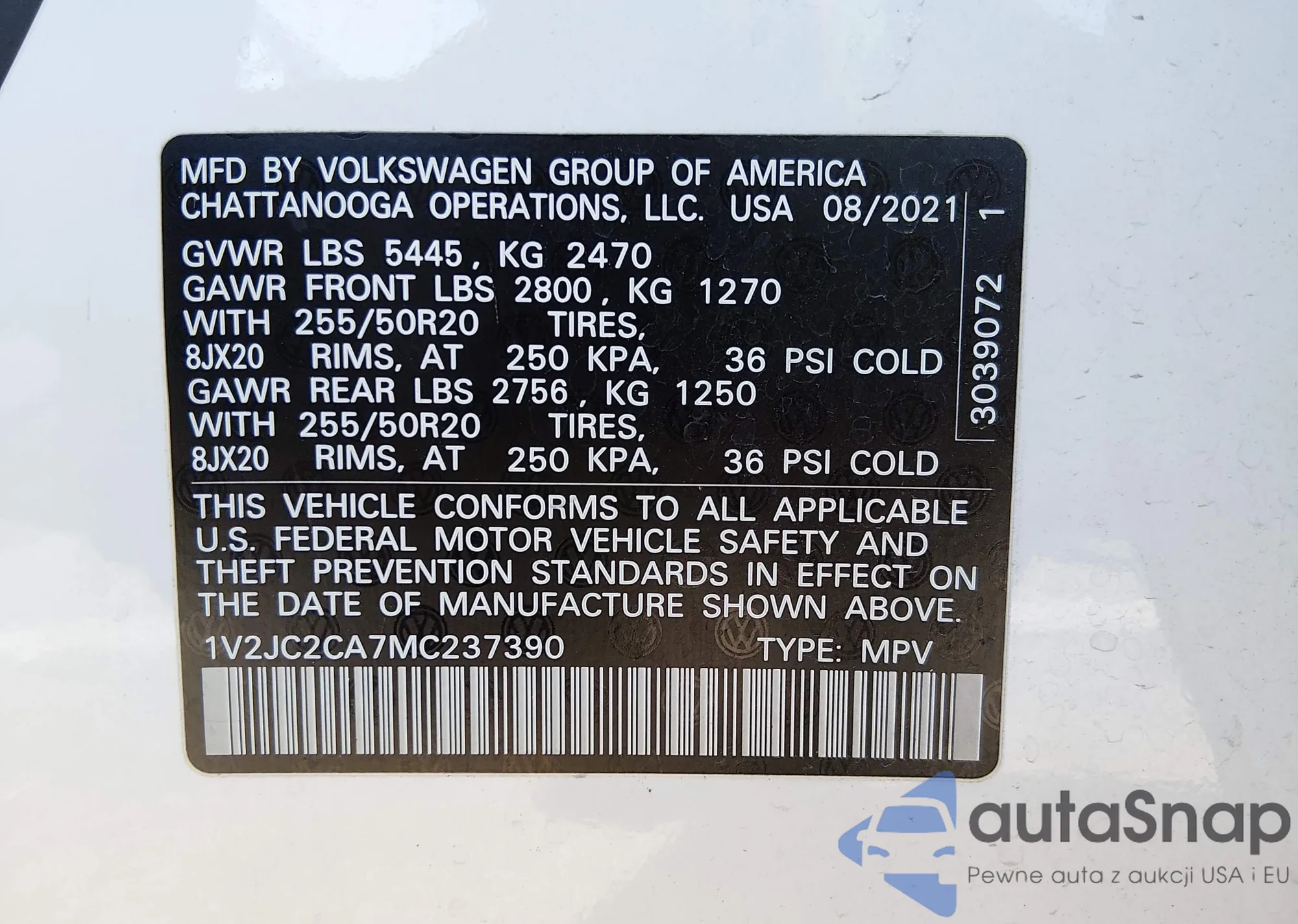 LOT: 44391493 VIN: 1V2PE2CA4MC201712