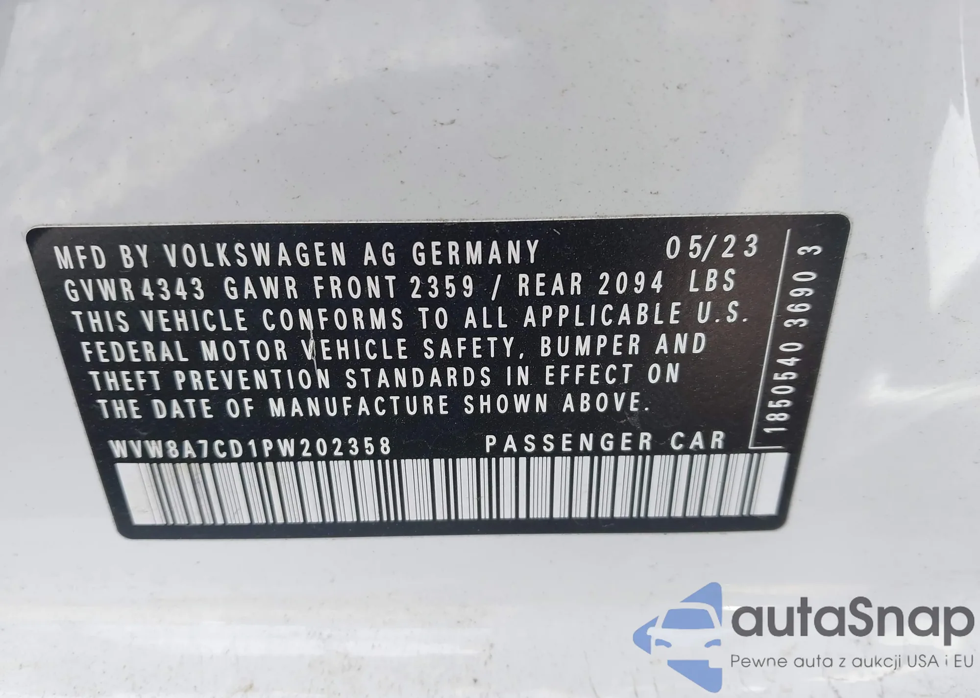 LOT: 44401546 VIN: WVW8A7CD1PW202358