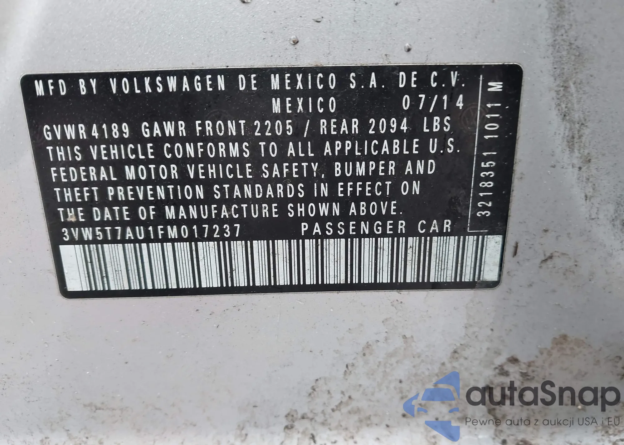 • VIN 3VW5T7AU1FM017237