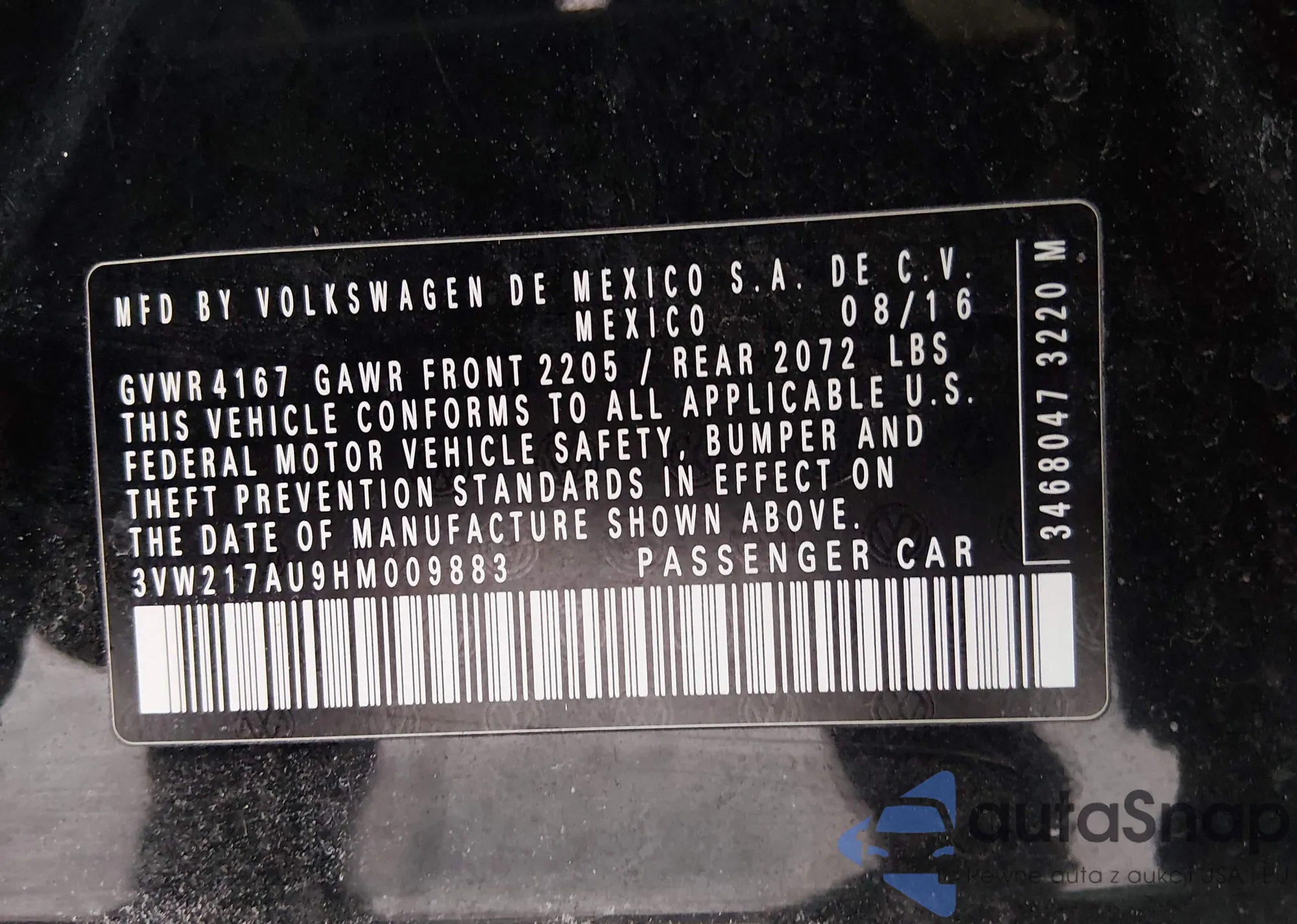 • VIN 3VW217AU9HM009883