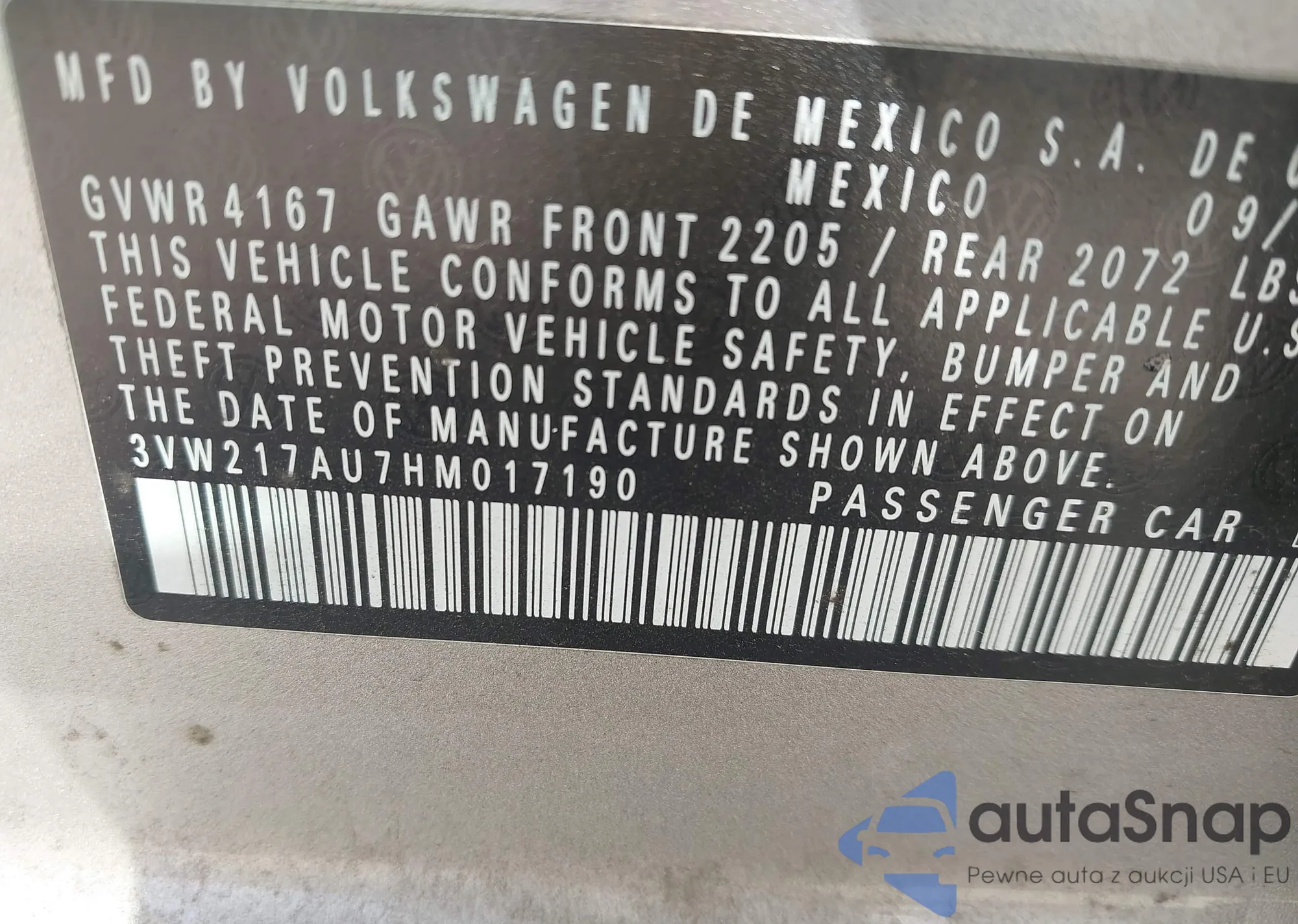 • VIN 3VW217AU7HM017190