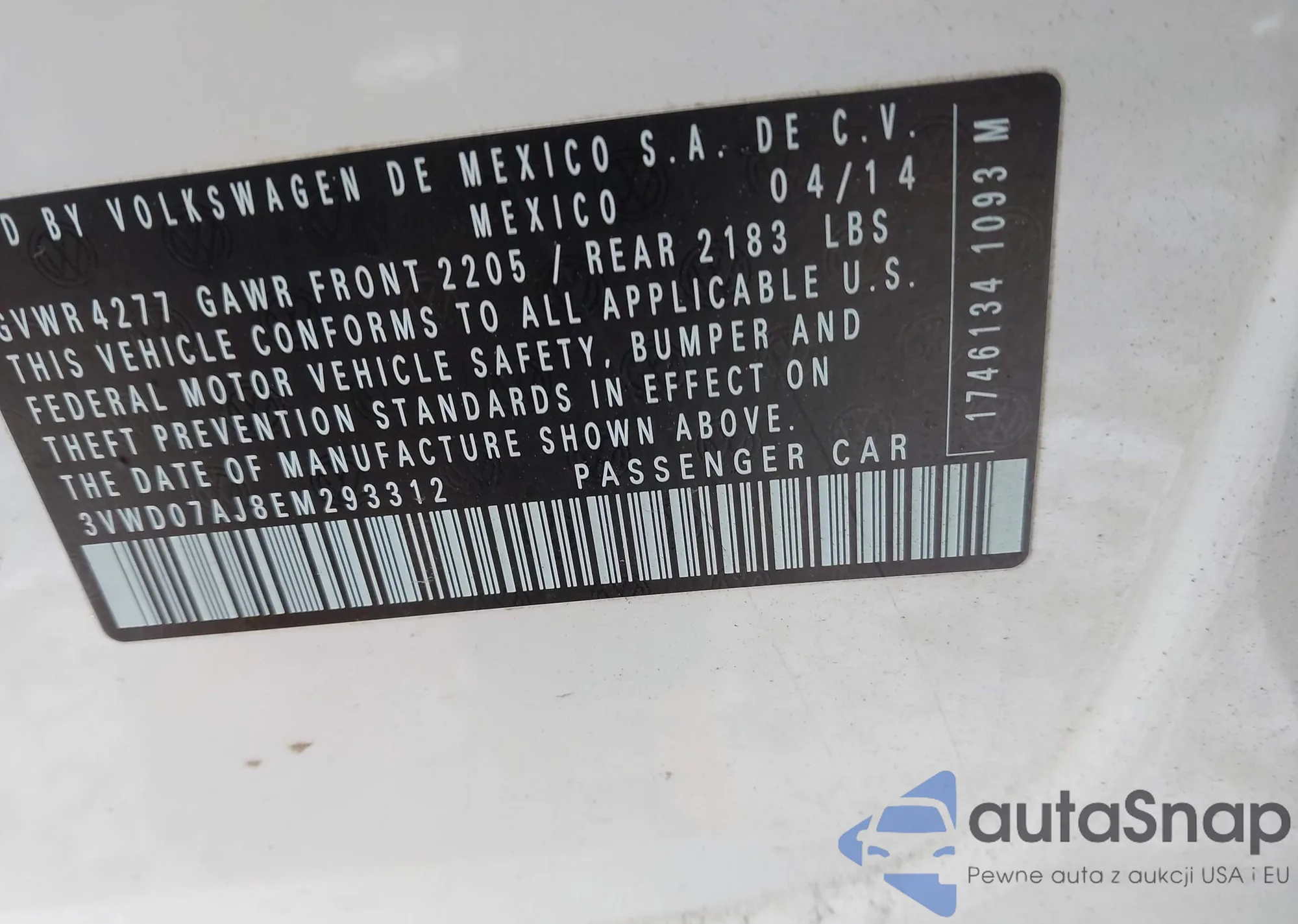 • VIN 3VWD07AJ8EM293312