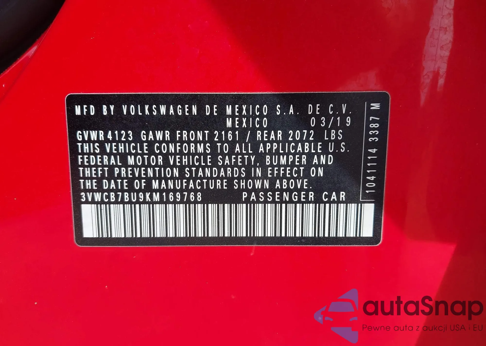 • VIN 3VWCB7BU9KM169768