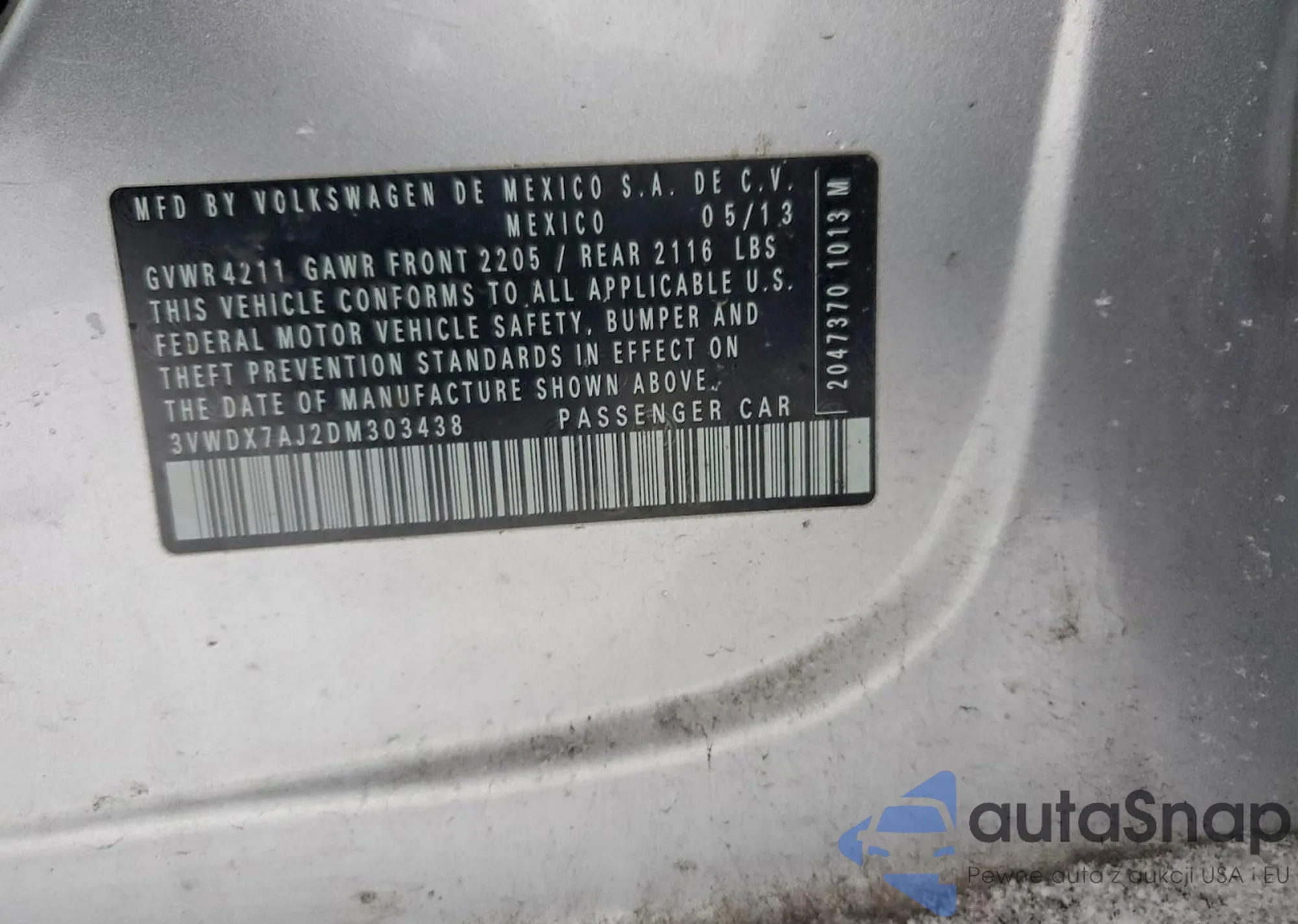 • VIN 3VWDX7AJ2DM303438