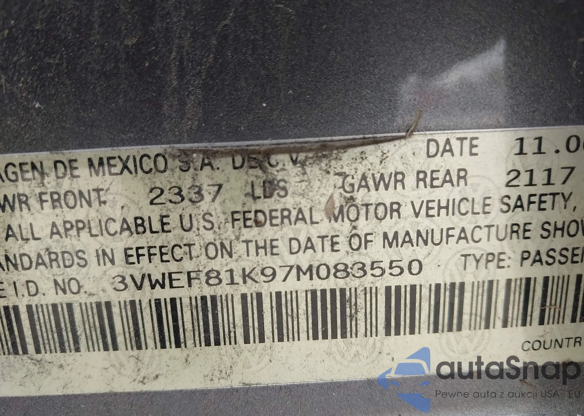 • VIN 3VWEF81K97M083550