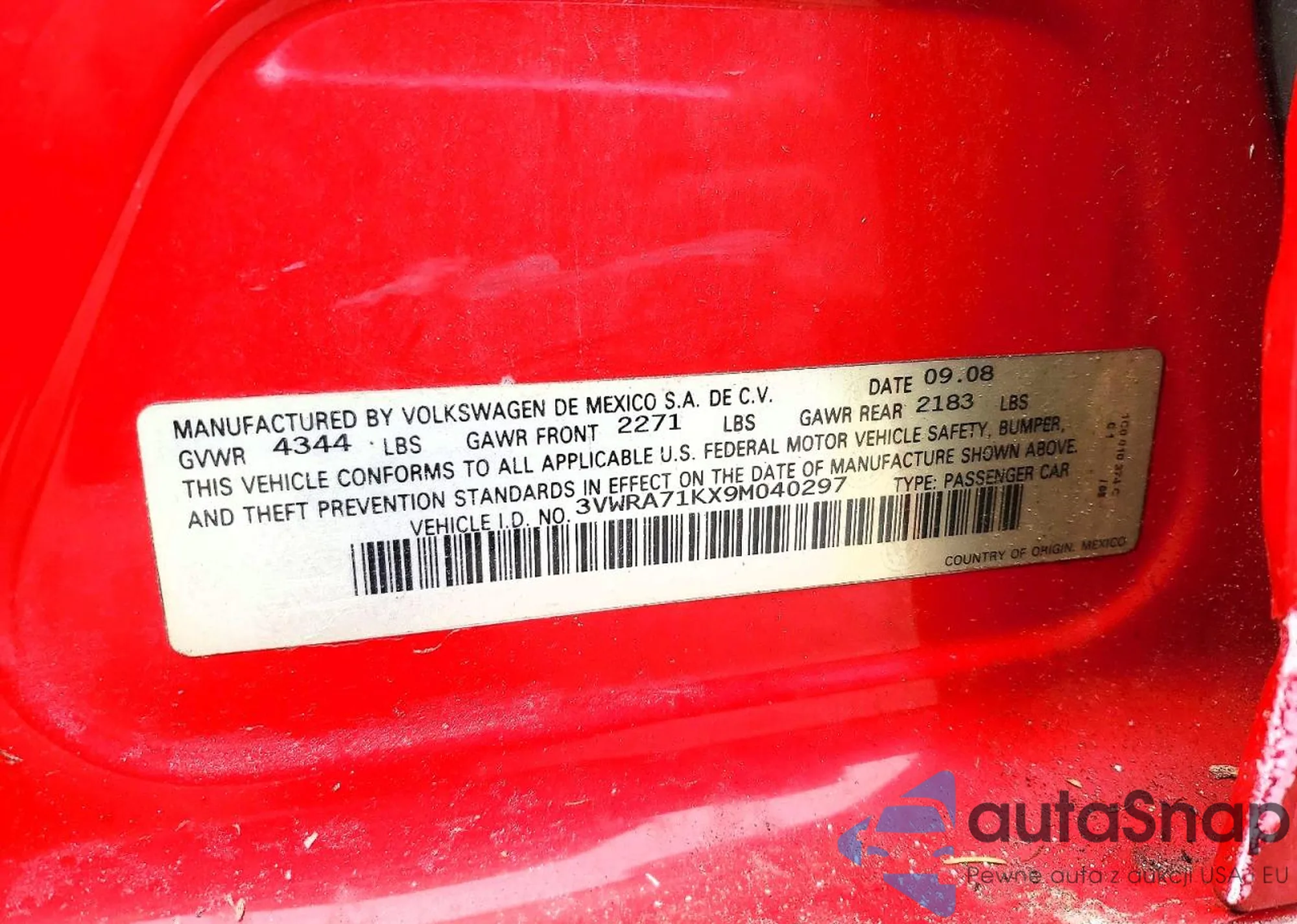 • VIN 3VWRA71KX9M040297