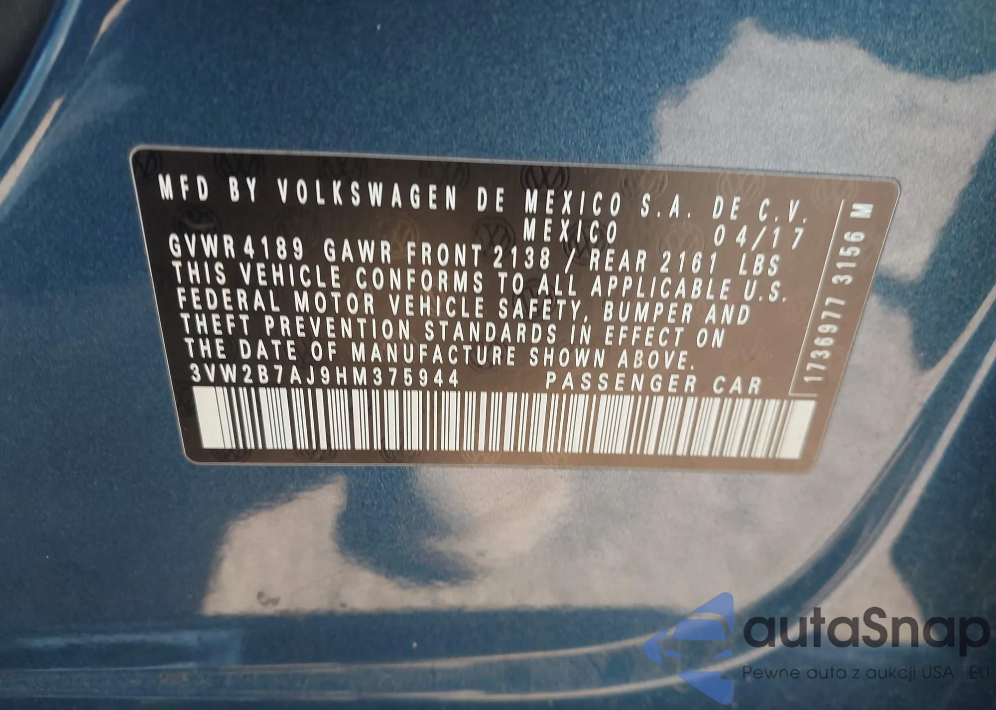 • VIN 3VW2B7AJ9HM375944