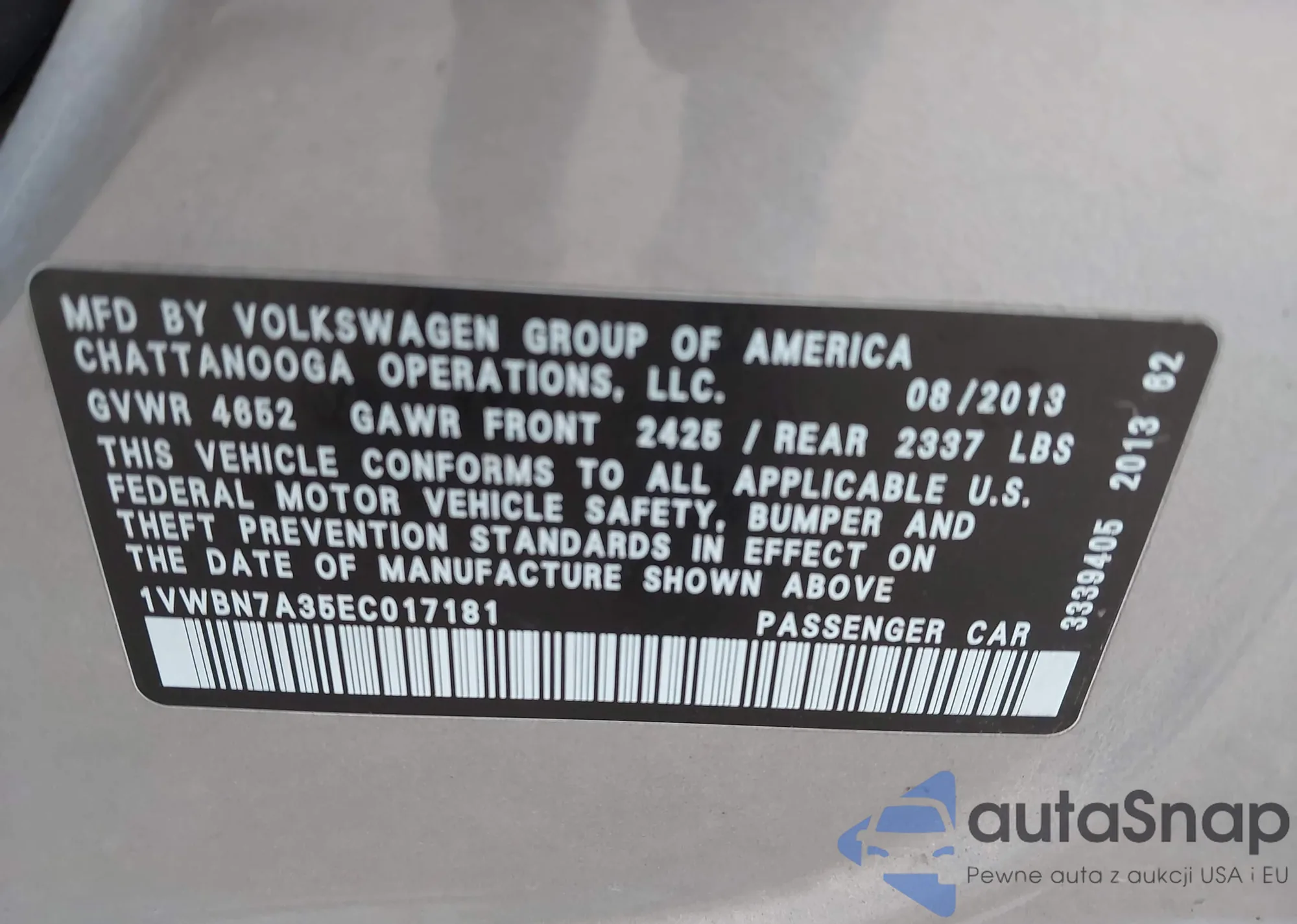 LOT: 43877384 VIN: 1VWBN7A35EC017181