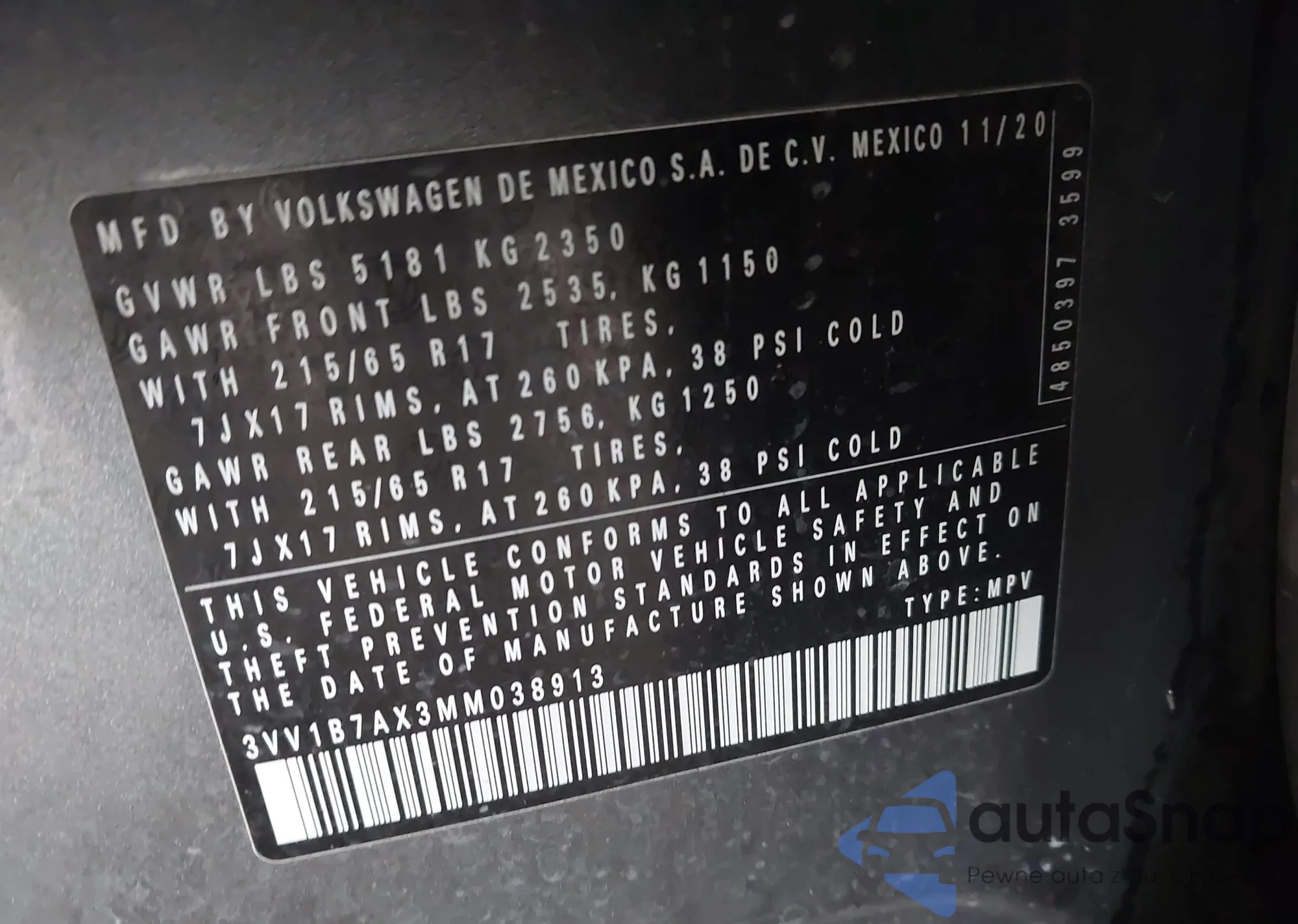 • VIN 3VV1B7AX3MM038913