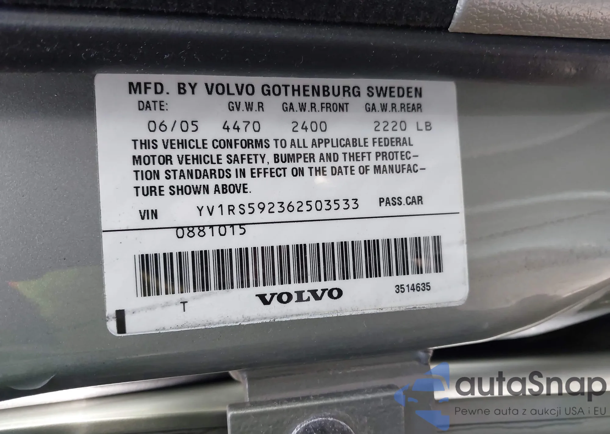 • VIN YV1RS592362503533