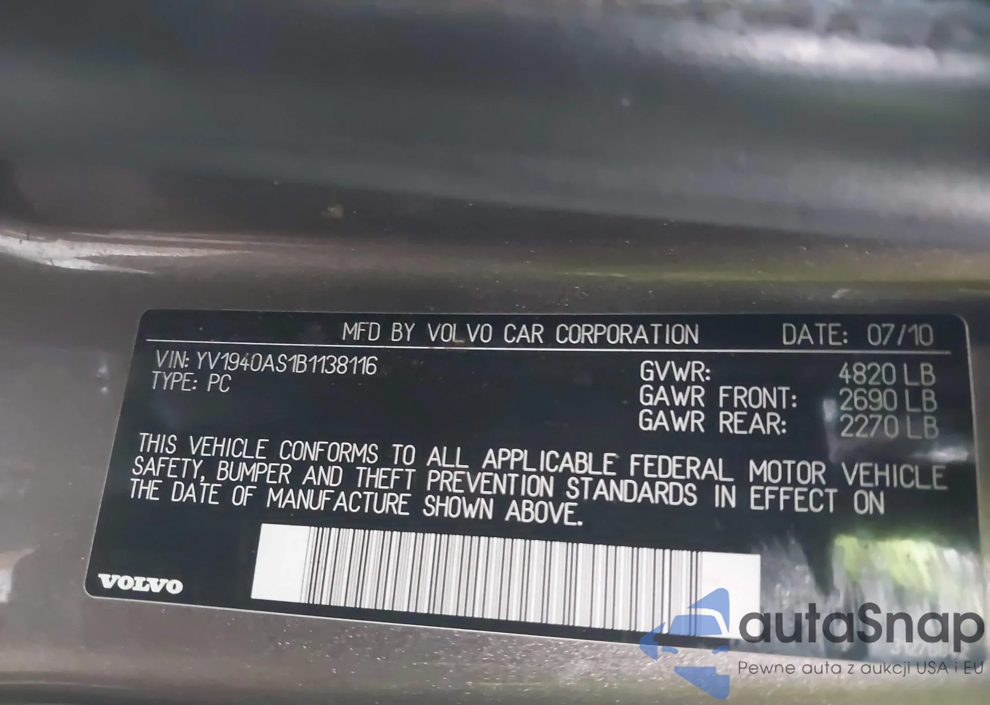 LOT: 44437332 VIN: YV1940AS1B1138116