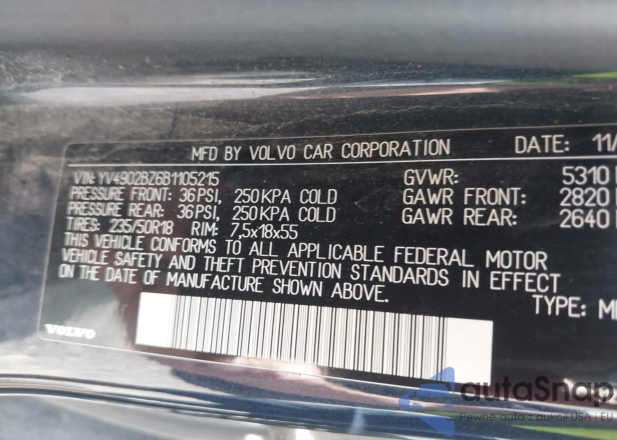 LOT: 44412345 VIN: YV4902BZ6B1105215